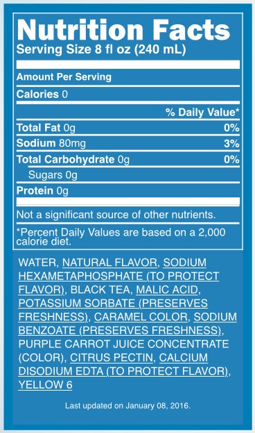 Blast Pizza serves the same Lipton “brewed” iced tea that is served at Taco Bell. Don’t be tricked into thinking this is fresh brewed iced tea, it is not. It is from a concentrated liquid and has a long list of ingredients shown below. Having said that, the actual taste isn’t as bad as you might expect. Most locations charge around $2 and have only one size. Refills are self serve.
