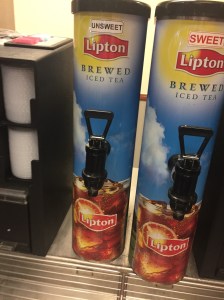 Chuck E. Cheese’s has the same Lipton “brewed” iced tea that is served at KFC and Taco Bell. A word of warning, this is not fresh brewed iced tea. It’s basically an instant tea made from concentrate. The long list of ingredients is shown below. Refills are self-serve.